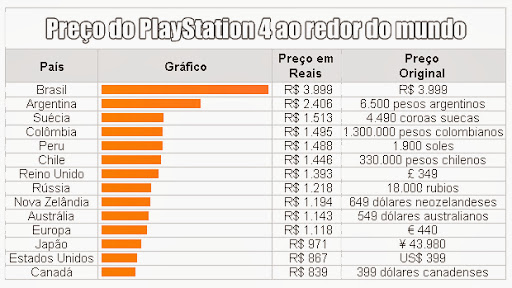A Sony anunciou nessa semana o preço do PS4 no Brasil. Os R$ 3.999 surpreenderam até os mais pessimistas que imaginavam que a Sony cobraria algo por volta da metade desse valor. Com esse preço o Brasil é disparado o país com o PS4 mais caro do mundo, cerca de 53% a mais que o equivalente na Argentina, que detém o segundo posto no ranking.