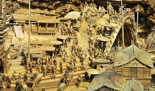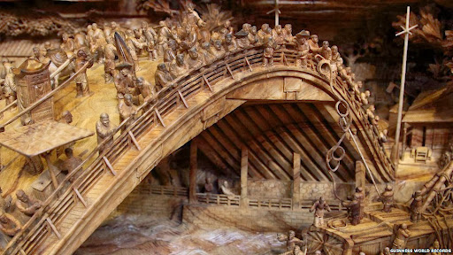 Sua surpreendente arte é digna do livro Guinness com o novo recorde mundial para a mais longa escultura em madeira, que mede 12,286 metros de comprimento, 3,075 metros de altura e 2,401 m de largura. Haja paciência para esculpir tantos detalhes em madeira, como barcos, pontes, edifícios e mais de 550 pessoas. Tudo esculpido individualmente.